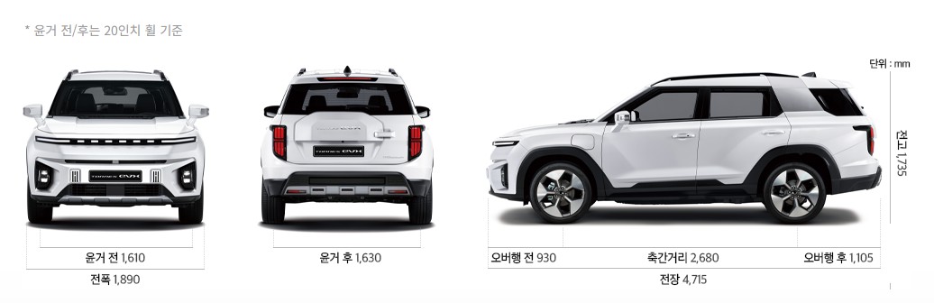 | 토레스 EVX 치수 | 전장/전폭 | 4,715mm / 1,890mm |