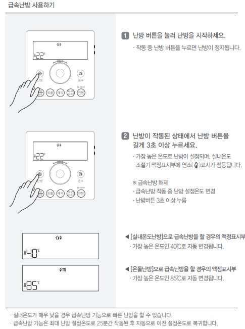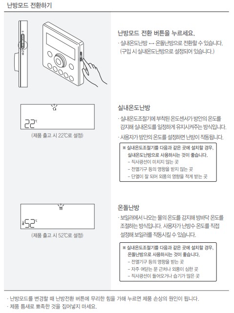 린나이 콘덴싱보일러 PJC8000 사용설명서 : 실내온도조절기 난방모드 사용방법, 설정방법