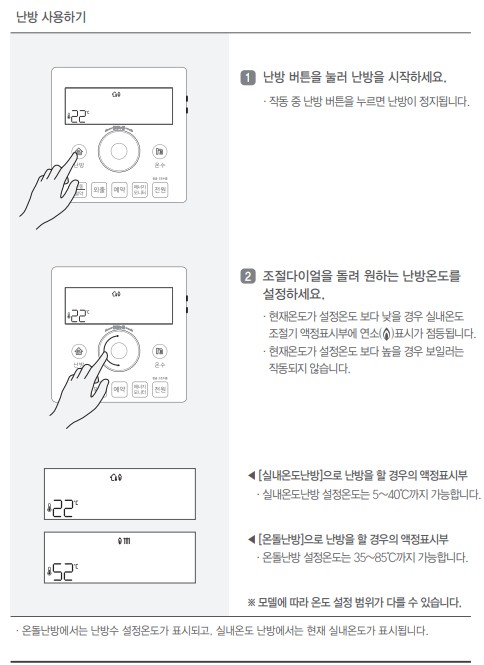 린나이 콘덴싱보일러 PJX9000사용설명서 : 실내온도조절기 난방 사용방법, 설정방법