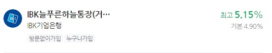 이자 높은 예금 추천 - IBK기업은행 IBK늘푸른하늘통장(거치식) 최고 5.15%