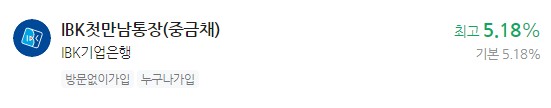 이자 높은 예금 추천 - IBK기업은행 IBK첫만남통장(중금채) 최고 5.18%
