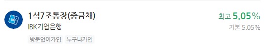 이자 높은 예금 추천 - IBK기업은행 1석7조통장(중금채) 최고 5.05%