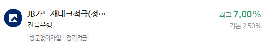 은행 이자 높은 적금 추천 - JB카드재테크적금(정액적립식) 최고 7.00% 전북은행