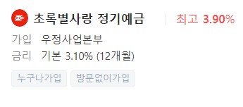 은행예금금리비교, 금리높은곳 - 우체국 초록별사랑 정기예금